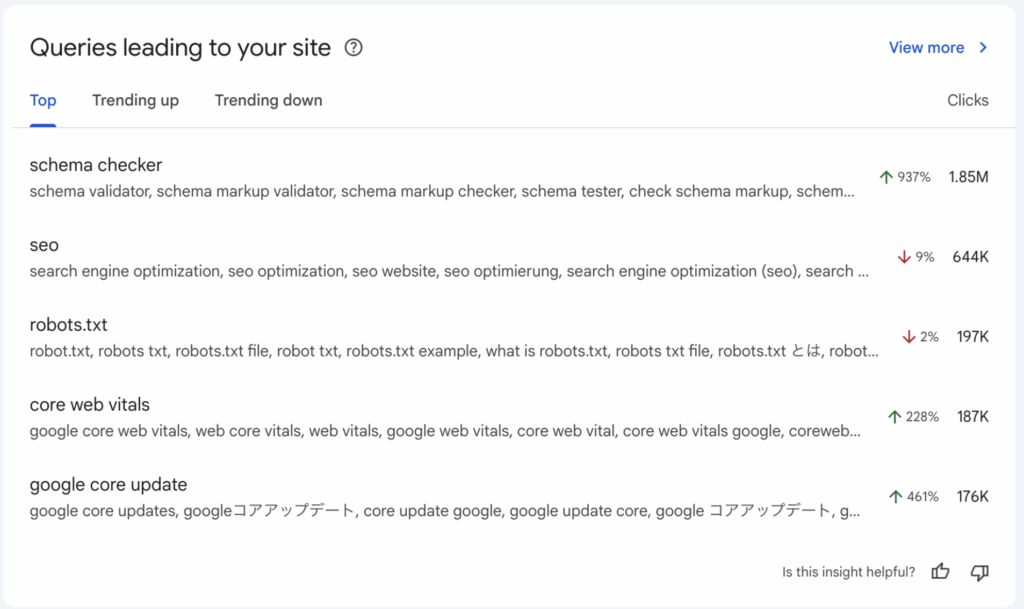 Google’s feature includes tabs like “Top”, “Trending up”, “Trending down” for query groups. This helps you spot rising topics fast.